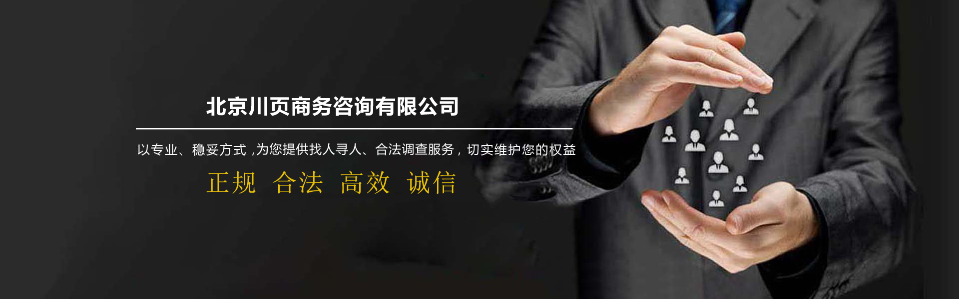 北京市偵探公司-北京川頁商務咨詢有限公司是面向全國提供找人尋人服務平臺,公司致力于為企業、個人解決發展中各類債務問題、債權訴訟、債權轉讓事務,幫助快速尋找親人、朋友、戀人、戰友等找人服務,以及婚姻家庭情感咨詢等業務。公司擁有一批律師,商賬管理師專業的工作人員,依托互聯網平臺,在國內形成了完善的調查尋人服務網絡,業務范圍已經逐漸覆蓋北京及全國各大主要城市和地區。我們始終秉承"捍衛真理、堅持誠信、以人為本、奉獻社會"的服務理念和"專業、創新、和諧、共贏"的經營理念,我們希望通過提供全面、及時、準確、專業的相關信息,以優質的服務,專業的技巧,為各位有需求的人員提供服務!